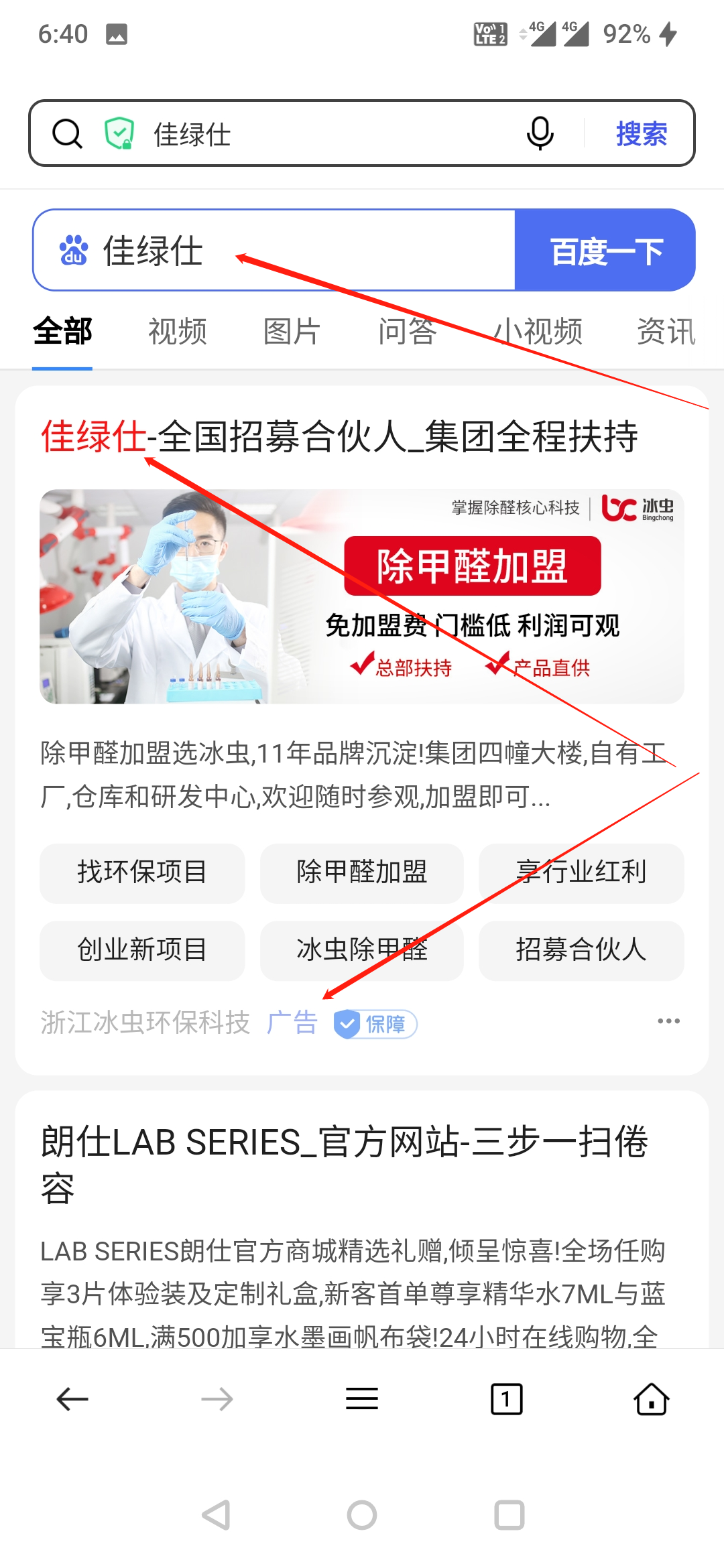浙江冰蟲環保科技有限公司利用我司商標"佳綠仕"進行百度搜索關鍵詞宣傳,嚴重影響我司合法權益。